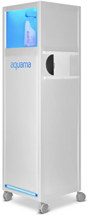 La technologie Aquama repose sur la production sur site d’une solution de nettoyage et de désinfection à partir d’eau, de sel et d’électricité. Ce modèle supprime le transport de bidons, réduit les volumes stockés et diminue les risques liés aux substances dangereuses.