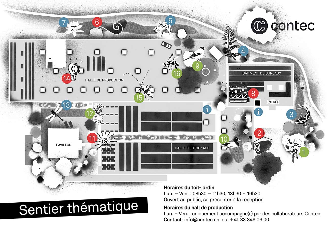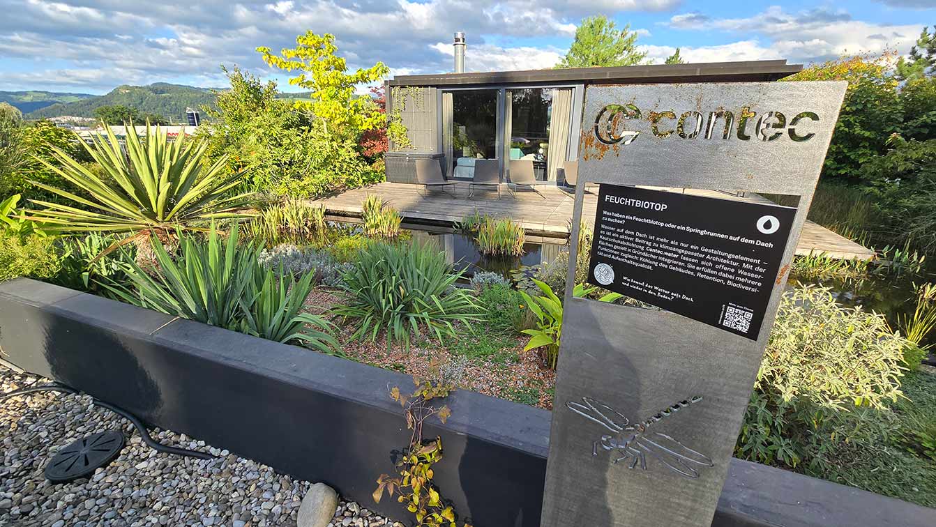Les toits plats peuvent aujourd’hui faire bien plus que protéger un bâtiment. Ils retiennent l’eau de pluie, rafraîchissent leur environnement et créent de nouveaux habitats. Sur le site industriel d’Uetendorf, le toit de Contec s’est transformé en véritable oasis : arbustes, fleurs sauvages, plantes résistantes à la sécheresse, étang avec roseaux et nénuphars, pavillon ombragé et même quatre ruches produisant environ dix kilos de miel par an. Lors des fortes chaleurs, la différence est palpable : tandis que les surfaces au sol peuvent atteindre 40 °C, le jardin sur le toit reste agréablement tempéré.
